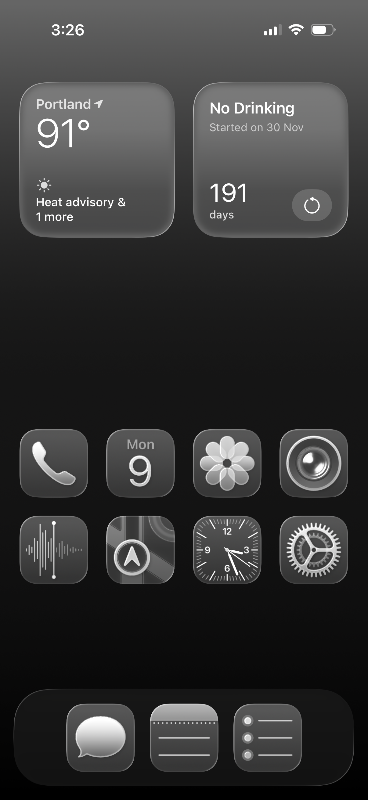 Even in my intentionally grayscale homescreen, I hope you can see that the differences are immediately apparent. Everything is transparent and shiny.